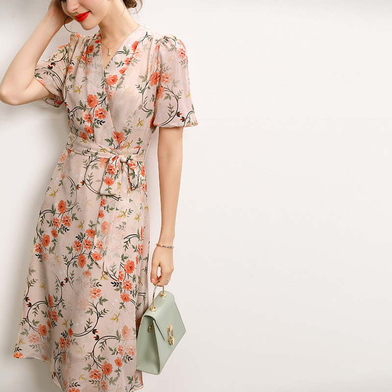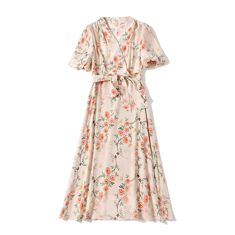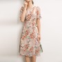 Main attributes Silk Dress Summer French V-neck Lace Up Style Waist Fairy Print Silk A-line Skirt